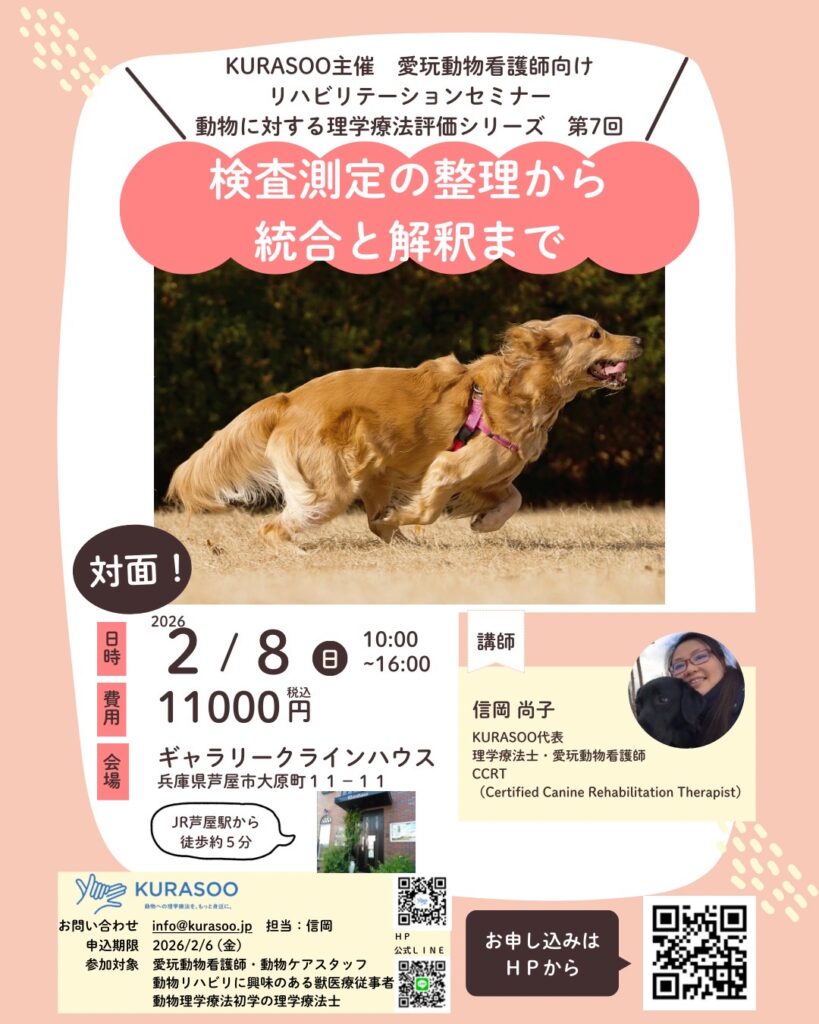 いつもKURASOOの活動にご理解、ご協力頂きありがとうございます 評価シリーズ第5回のお知らせです第5回 「検査測定項目の列挙」 評価シリーズセミナーも第5回になりました。今回のテーマは「検査測定項目の列挙」について学びます 動物リハビリテーシ... -